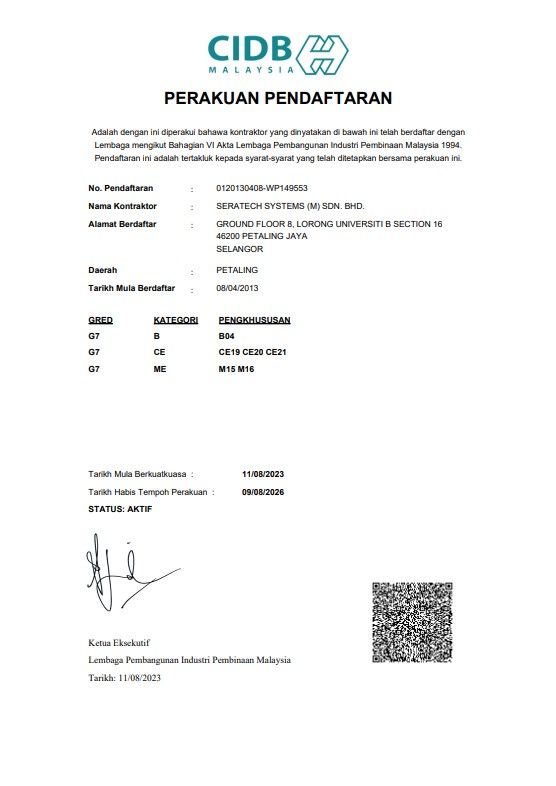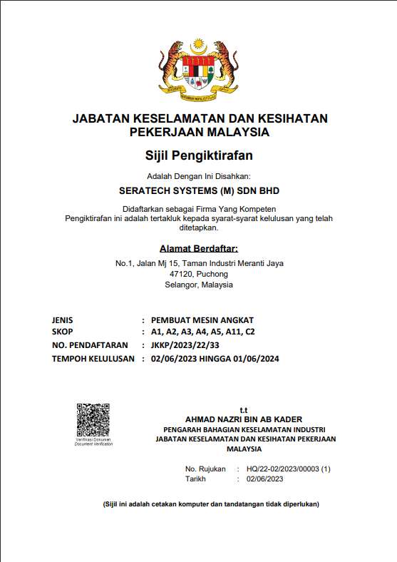 At Seratech Systems (M) Sdn. Bhd., we take pride in our certifications, which reflect our commitment to quality, safety, and industry standards. These recognitions showcase our expertise in hoist and crane systems and reinforce our dedication to delivering reliable material handling solutions that meet regulatory and operational excellence.